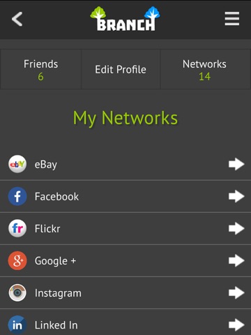 Branch allows you to add and search for users on: Facebook, Twitter, LinkedIn, MySpace, Google+, eBay, SoundCloud, Tumbler, Pinterest, Flickr, YouTube and Instagram.