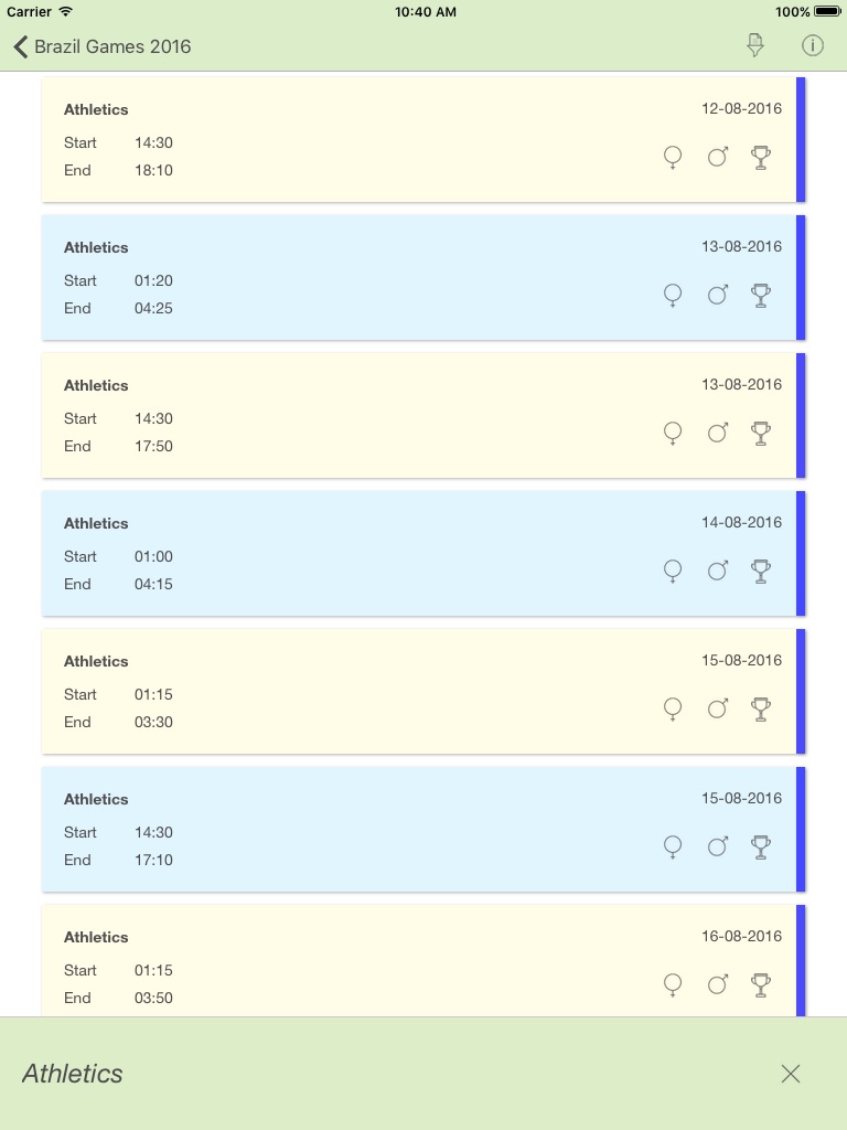 Disclaimer: The Olympic symbols, the Olympic rings, the Rio 2016 emblem, the word marks, the mascot of the Olympic Games, the words “Rio 2016 Olympic Games”, “Olympic” and other Olympic-related terminology are trademarks of exclusive property of IOC - International Olympic Committee - Olympic.org. If appearing in this app, they are used by bona fide in editorial context for legitimate reporting and informational purposes only. This is an unofficial app, not related in any way with The Olympic Committee.