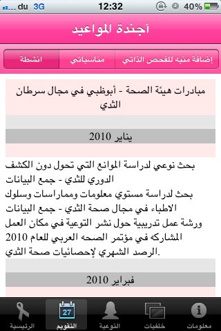 This application is designed to help raise awareness about Breast cancer. Detection of breast cancer at an early stage and effective early treatment are the best ways of ensuring total cure. The earlier the diagnosis is made, the better the chances are in terms of survival and of only requiring minimally invasive treatment. The key feature of this app is a personalized monthly reminder to carry out Self Exams, with complete, easy to follow instructions. This is a joint effort between Health Authority-Abu Dhabi And ADMC to use intimate media in tackling major health initiatives within the UAE and surrounding region.