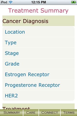 Breast Cancer Treatment is an app for those who have completed their treatment for breast cancer. As a breast cancer survivor, you want to make sure that you continue to receive the best health care possible. An important aspect of "after treatment" care for breast cancer is having a summary of the treatment that you received and details about your cancer treatment instantly available to optimize your future health care situations.