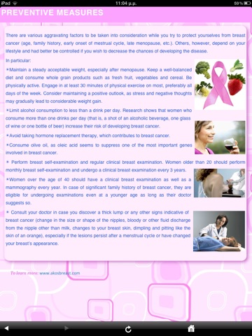 The application contains concise but important information that aims to emphasize the importance of early diagnosis, to indicate the risk factors for disease development, to recommend preventive measures and highlight the importance of regular self-examination and mammography, combined with regular visits to a clinician.