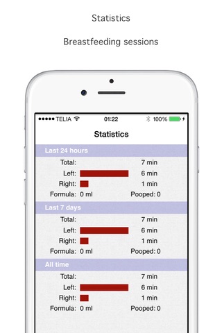 * Statistics from all breastfeeding sessions, last 24 hours, last 7 days and all time.