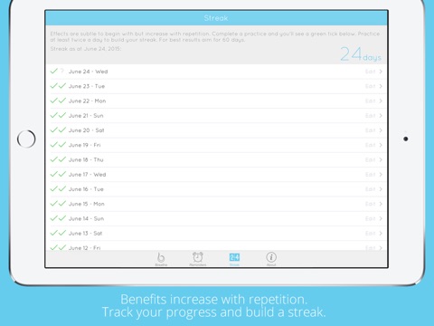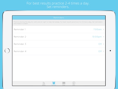 Practice at least twice a day. Set reminders to get into a routine. To help fall asleep, practice when you get in bed or if you wake in the night. If youre feeling stressed or feel like you need to settle your nerves, practice to get a "hit" of calm.