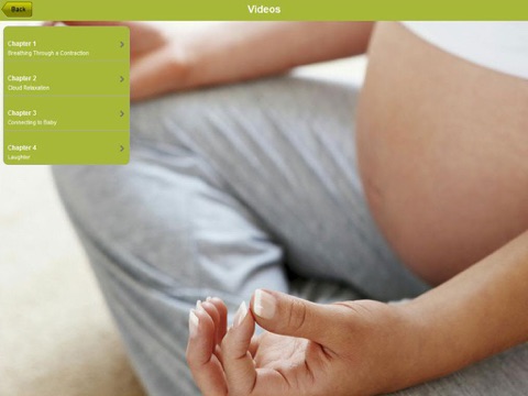 Breathing through a contraction demonstrates the breathing technique that we learn in class. This breath has been very successful for lots of the ladies who come to the classes. They say it is really does help them focus on the breath and remain calm through each contraction. The chapter also shows a sighing breath, which is fabulous to release any tension that may have been acquired during the contraction.