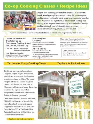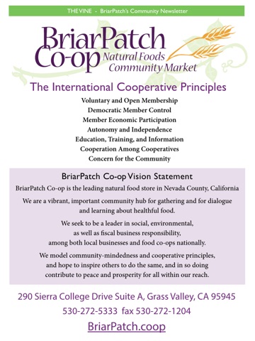 The Vine is published bimonthly (one issue every two months) in both digital and print formats as an information and news service for BriarPatch Co-op Owners and community members in Nevada County, California and surrounding counties in Northern California. The BriarPatch Vine supports the BriarPatch Co-op mission to be a community hub for dialogue and learning about healthful food, sustainable practices, and earth-friendly products.