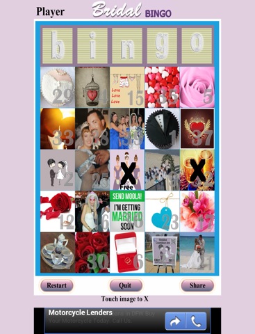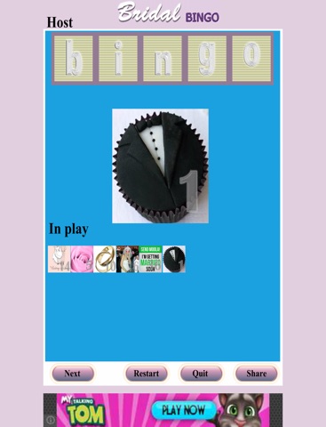 Filled with 39, beautiful images. Users choose role of "host" or "player". Choose "Host" to announce bingo images (or image number) in play. Choose "Play" for a randomly generated card. If image announced is shown on players card; players touch corresponding image to "X" & cover it up.