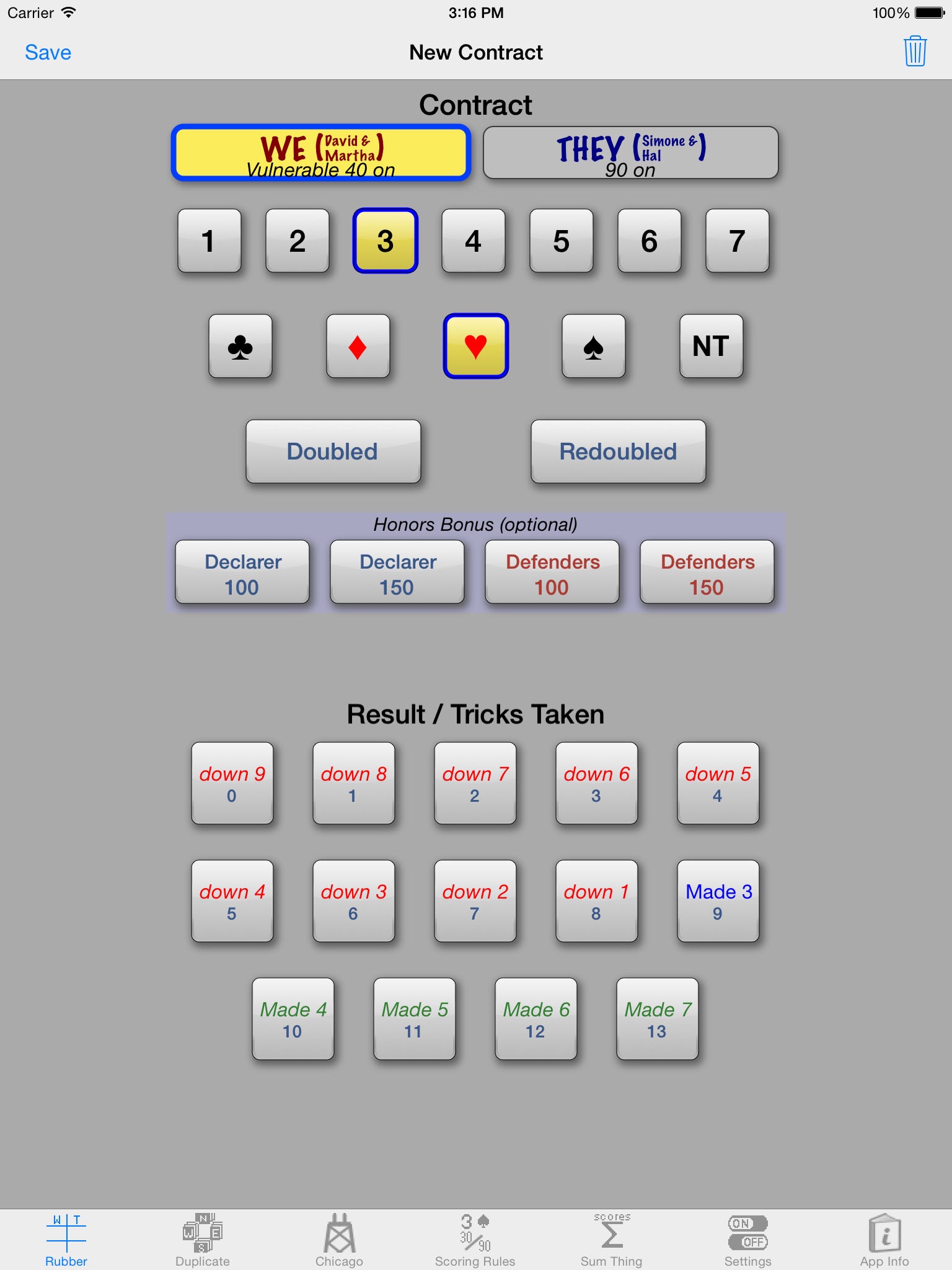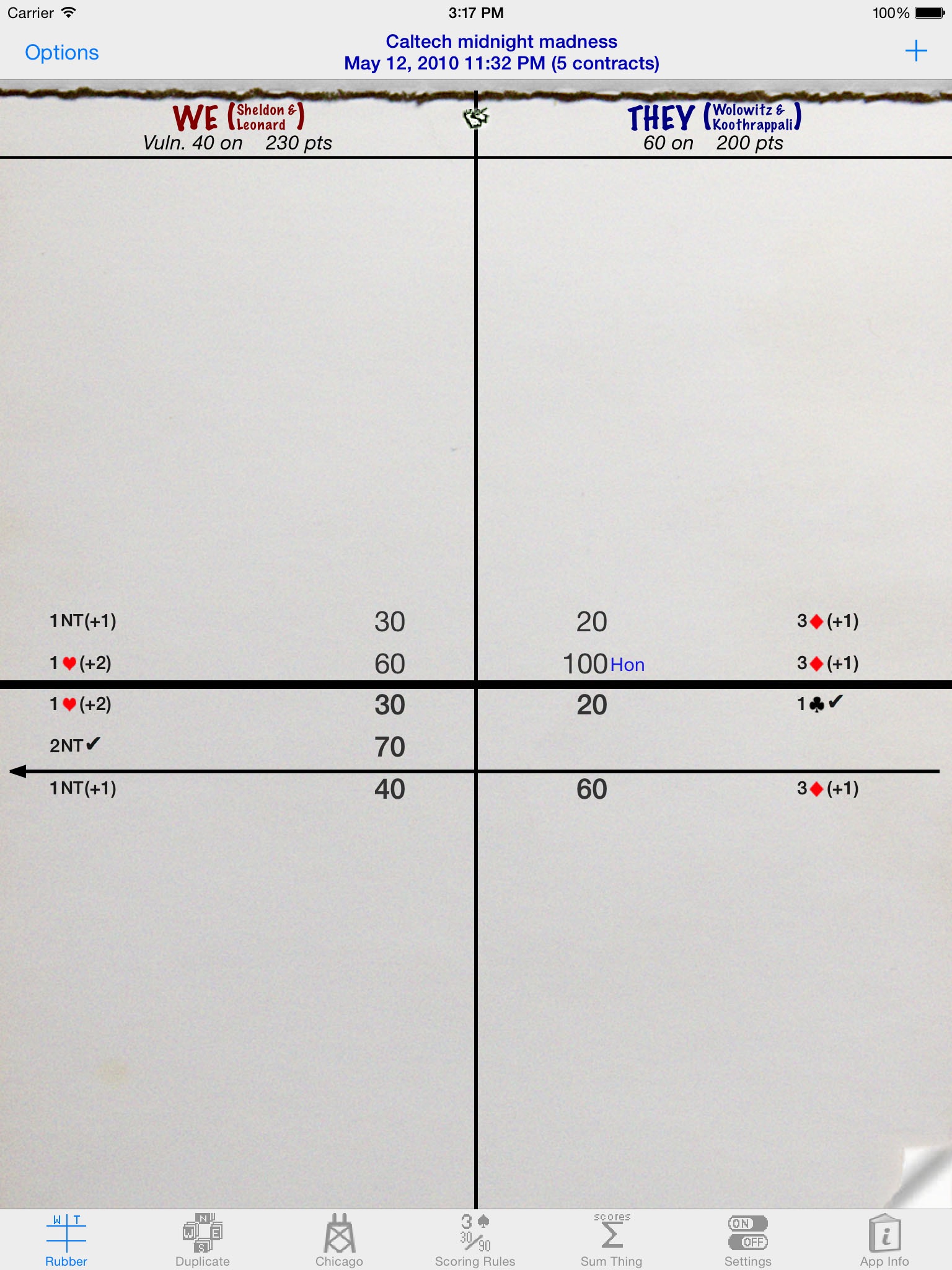This app needs an option to total the score in the duplicate interface and keep track of scores for each player for those playing party bridge and using duplicate scoring. Itd be nice if it could also calculate winnings for party bridge players. What it does so far is good. Ill give it five stars when it adds these features.