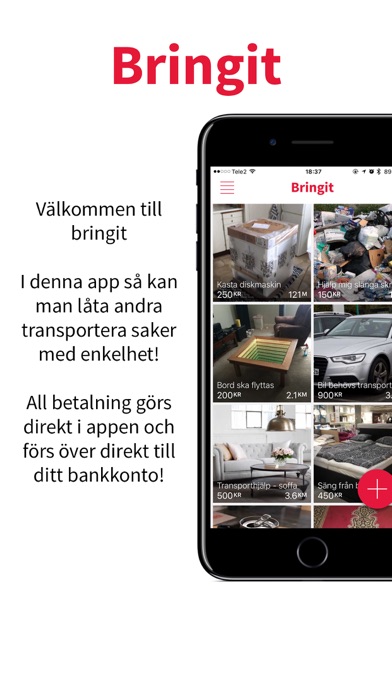 Bringit är en app där du enkelt annonserar om transporthjälp samt snabbt och enkelt kan tjäna pengar på att transportera saker åt andra. Betalningen sker direkt i appen och pengarna förs över till ditt bankkonto.