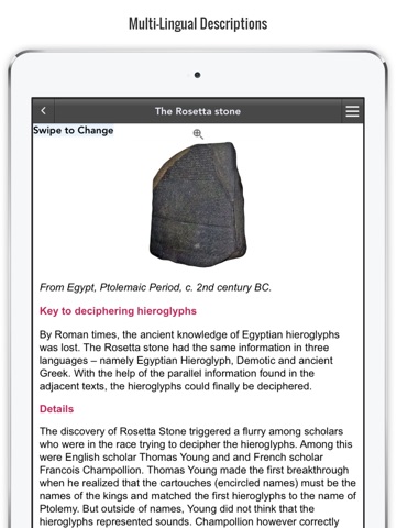 The app also provides you with the best one-hour tour of the museum, which is basically a superb itinerary covering its top 15 highlights. But if you would like to deep dive, there are over 500 highlights to choose from. Starting from the world-famous Rosetta Stone our tour route takes you through the famous antiquities of the ancinet world, including the Parthenon sculptures also known as the Elgin Marbles. Follow the route upstairs to see mummies followed by a tour of the Anglo-Saxon treasures kept at the British Museum. With this app, you can revel in the fantastic and unrivalled collection of the museum for as long as you like. We welcome you to explore