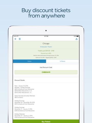 • Build a list of favorites and get notifications when your favorite shows have discount offers available or ticket lotteries pop up!