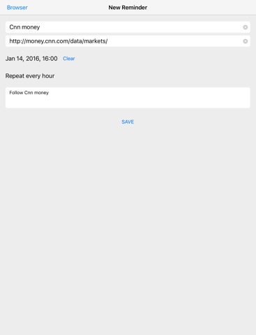 To add a repeating reminder you can use hourly, daily, weekly or custom repeating options. You can also set up to-do list reminders to organize your events throughout the day. In order to add a simple to-do list reminder, leave the website address box empty. Sample reminders assist you to fill name, website address, date & time fields in New Reminder view.