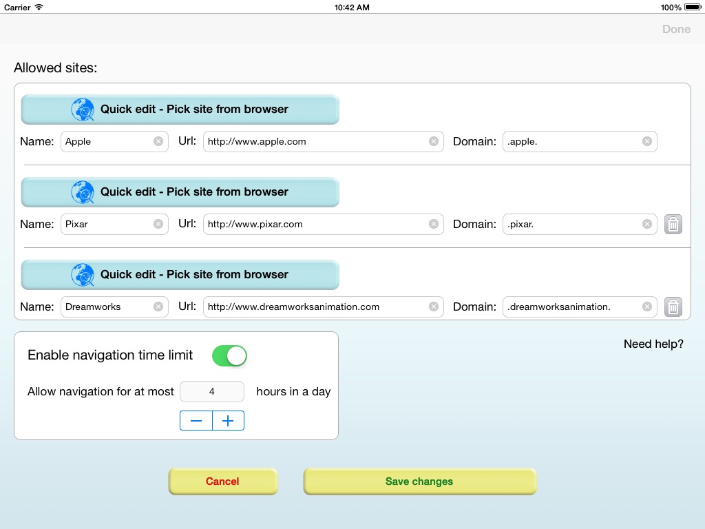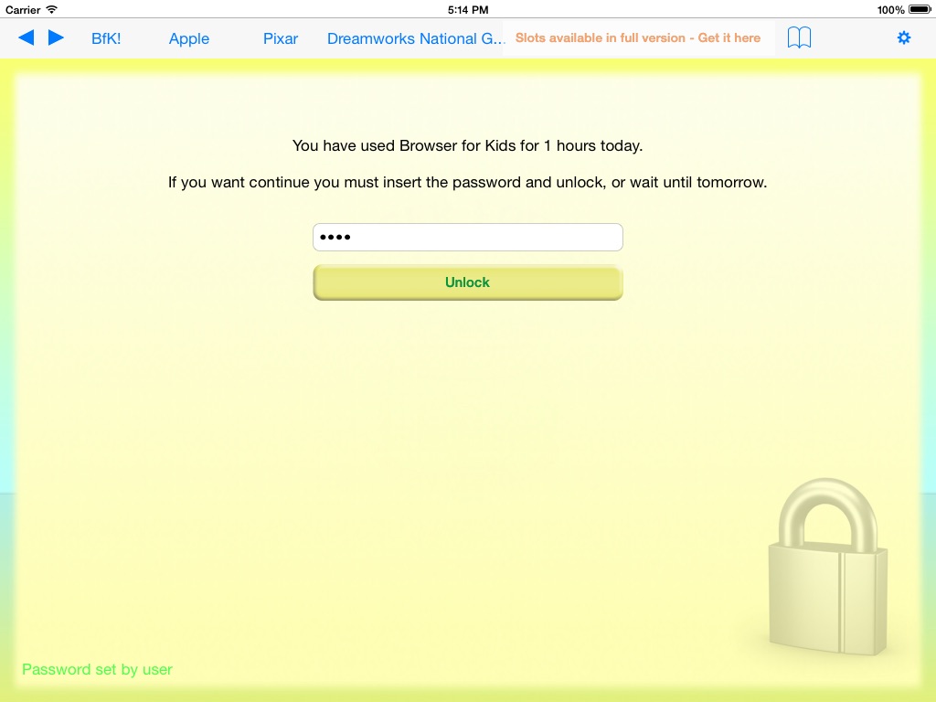 Browser for Kids Lite has an optional daily navigation time limit: parents can set how many hours their kids can navigate in a day.