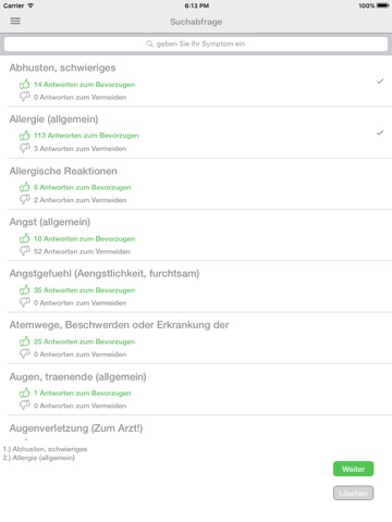 Die App zeigt auf, ob zu Ihren Fragen ein Tee/Kraut oder Lebensmittel mehrfach vorkommt. Hierdurch können Sie sich auf eine effektive Auswahl bei Ihrer Gesundung begrenzen.
