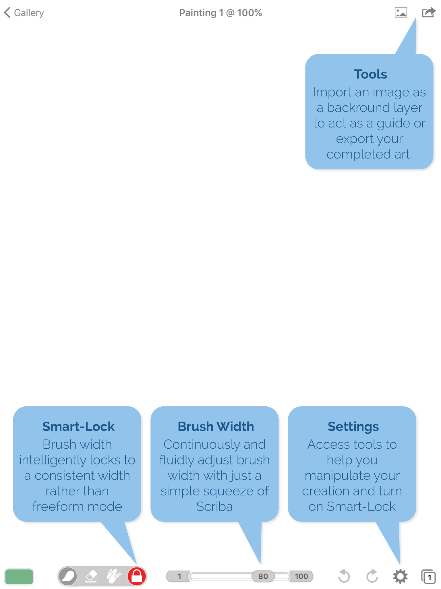 Brushes for Scriba is based on the popular open source app Brushes Redux however this special edition has been enhanced to include additional functionality that exemplifies the capabilities of the Scriba stylus.