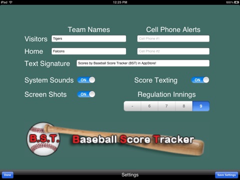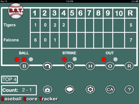 Baseball Score Tracker (BST) is a very simple application that allows you to keep track of the score at baseball games. You can track it all; balls, strikes, outs and runs. The app is designed to look like an official ball park scoreboard that breaks down the runs by innings.
