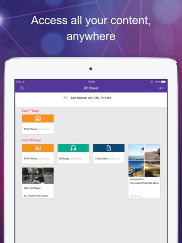 Your life is at your fingertips with BT Cloud App. It securely backs up and syncs your contacts, photos, videos and documents in one safe place. Access and share your content across different devices – anytime, anywhere.