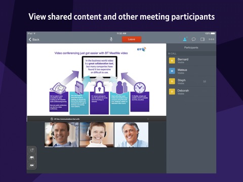 Video conferencing is easy with BT MeetMe video. When used in combination with a valid BT MeetMe account, teams can collaborate over audio and/or video; whichever makes sense for a given conference.