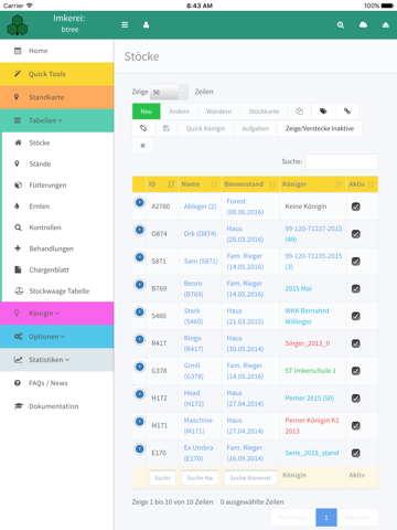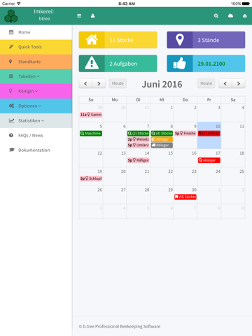 In our beekeeping app most of the data is shown in tables for better overview of big data, also you can export your data as CSV for save keeping of the data yourself and optionally generate a full database backup with all your saved data. An interactive calendar on the dashboard helps to keep an overview over your past task and upcoming beekeeping events. Premium user can also access the API which allows them to export the iCal events and have access to helpful and responsive statistic in our beekeeping software.