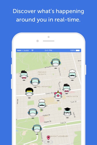 The live map shows you what’s hot & happening now so there’s no need to plan ahead. “Done with dinner & curious what’s happening around the block?” Bubblapp has you covered.