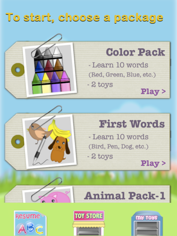 * In-App Purchase packages (15 words and 4 toys each)