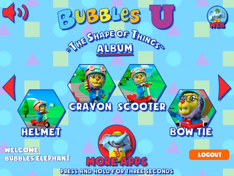 Kids draw scenes from the Bubbles the Elephant® video episode “The Shape of Things” by following numbers starting at one, and ending at a maximum of fifteen. Bubbles helps and encourages kids, saying “great job!” or “that’s correct!” after each completed drawing; then players can save the colorful image in an album.