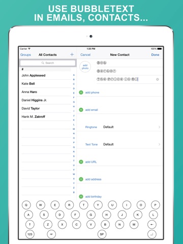 BubbleText Keyboard for iPhone, iPad, and iPod Touch is a new keyboard that enhances your old keyboard and allows you to type in text surrounded by bubbles. Show more emotion, creativity, and flair when typing on your mobile device. Be more spirited in your next text, email, or Facebook post using BubbleText Keyboard and show off the full potential of your device running the iOS 8 or iOS 9 software.