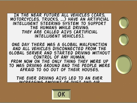 Help BucketMan to fight back the AIV´s (Artificial Inteligent Vehicles) that took over the cities of the world.