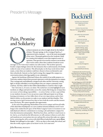 Bucknell Magazine is the primary University print communications vehicle for all alumni and is also mailed to current parents, faculty, staff and seniors. Published quarterly, this 72-page full color magazine aims to keep our readers informed with University news, in-depth discussion of topics important to the Bucknell community and to help keep alumni connected through class notes.