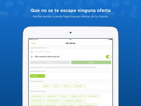 - Ser notificado en cuanto haya una nueva oferta de tu interés. Con alertas de palabras clave puedas registrar palabras como "PS4", "iPhone" o "tablet" para que te avisamos cuando alguien comparta una promoción relacionada.