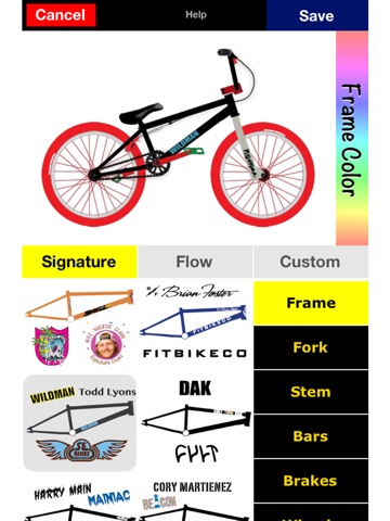 This app is perfect, I like how it incorporates actual companies, and gives you a lot of freedom, i do wish you could edit the bikes again once your finished tho. More actual parts should be included and I think you should be able to customize the wheels more such as the hubs, and you should be able to choose between different types of stems frontload and topload. Otherwise this app Is amazing, just as I thought it would be, could be a little better, but its worth the dollar 9/10. If you like bmxing you should get this app, especially if you cant decide what colour your next part should be!