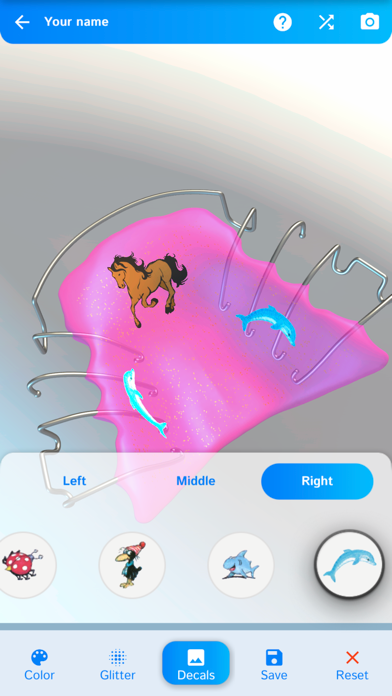 Build-a-brace will help you design your very own removable brace. Be inspired by the samples or create your own design. Or just give your smart phone or tablet a shake and see what the app comes up with! Select the color you want from the Dentaurum range of acrylics Orthocryl® and Orthocryl® LC. There are also six glitters to choose from and more than 30 decals. There is something for everyone – from a football to a unicorn!