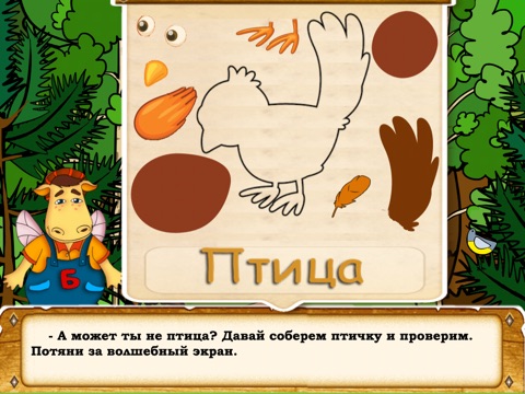 Интересный сюжет с элементами интерактивности удерживают внимание ребенка. Ведь это так забавно разогнать облака, разбудить Буквоеда, собрать птичку из отдельных элементов, а еще сделать пусть небольшое, но самостоятельное открытие и узнать основные признаки птиц . Интерактивная сказка доступна в двух режимах : читать и слушать. В конце сказочной истории ребенок сможет собрать 6 пазлов и закрепить понятие «Птицы».