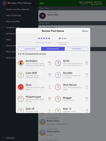 Bumper Pool is an exciting variation of pool in which you battle head-to-head against your opponent to sink all of your balls first! The bumpers on the table are the key to victory; use them skillfully to pull off trick shots or else they can squash your lead. As the name implies this app is DELUXE and includes many ways to play and plenty of challenge and achievements to earn!