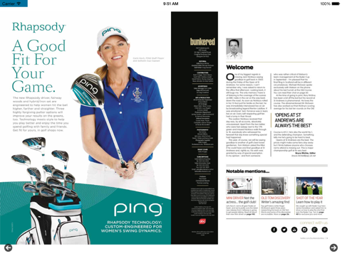 The magazine is renowned for its diverse quality and coverage of the game, including interviews with the biggest players in the world - past and present - and insight into the biggest issues facing the sport. Featuring extensive equipment coverage, instruction from a team of dedicated and award-winning PGA professionals and showcasing the best places to stay and play, bunkered is the best-selling golf magazine per capita in the United Kingdom.
