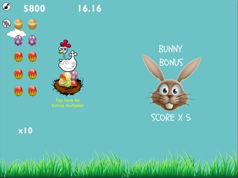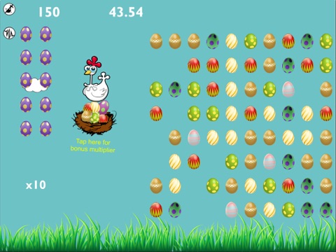 Collect as many pairs of eggs as you can in 1 minute to score big. If you reach the level goal for pairs gained you will get another minute of continued play. What level can you achieve? Chain as many pairs of the same pattern as possible to increase each eggs value. You’ll start off scoring small but as you match the eggs you’ll also start to get your multipliers building up quickly with the whacky multiplier chicken. How? Collect 5 pairs in a row and that Chicken will appear and squawk at you so you can tap into that magic multiplier. Extra Bunny Bonus earned if you can clear the entire screen of eggs!