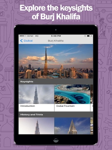 Burj Khalifa Dubai Travel Guide takes you to At The Top, Burj Dubai. Burj Khalifa Dubai Travel Guide mobile app has details about Burj Khalifa, Armani hotel Dubai, Dubai Mall, At the Top Observation Deck and Dubai Fountain to enhance you trip to this iconic building and worlds tallest man made structure.