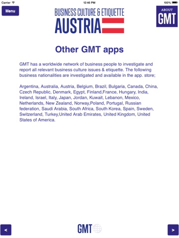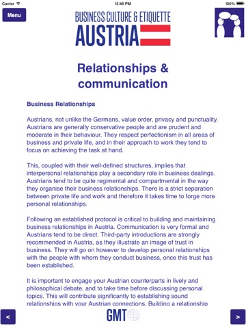 Knowing and respecting cultural backgrounds of your counterpart(s)Austria is essential to do business successfully. This App delivers all relevant information with respect society & culture, business culture & behavior, relationships & communication, meetings, negotiating, appearance matter, gift giving etiquette, habits concerning meals & drinks. This App is also valuable to prepare your internship to Austria.