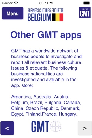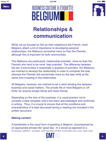 This App delivers all relevant information with respect to society & culture, business culture & behavior, business relationships & communication, meetings, negotiating, appearance matter, gift giving etiquette, habits concerning meals & drinks, language matters. This App is also valuable to prepare your internship.