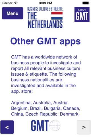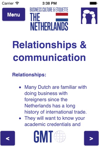 Knowing and respecting cultural backgrounds and business behavior of your counterparts in the Netherlands is essential to do business successfully. This App delivers you all relevant information with respect to society & culture, business culture & behavior, business relationships & communication, meetings, negotiating, appearance matter, gift giving etiquette, habits concerning meals & drinks, language issues. This App is also valuable to prepare your internship. We wish you a pleasant and great business in the Netherlands.