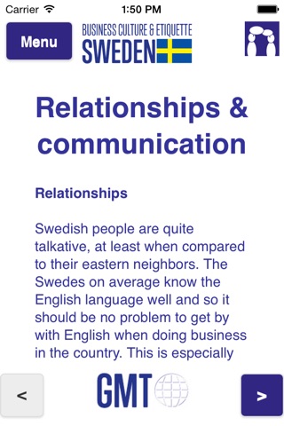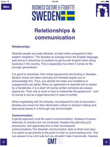 Knowing and respecting cultural backgrounds of your counterpart(s) in Sweden is essential to do business successfully. This App delivers all relevant information with respect society & culture, business culture & behavior, relationships & communication, meetings, negotiating, appearance matter, gift giving etiquette, habits concerning meals & drinks. This App is also valuable to prepare your internship to Sweden.