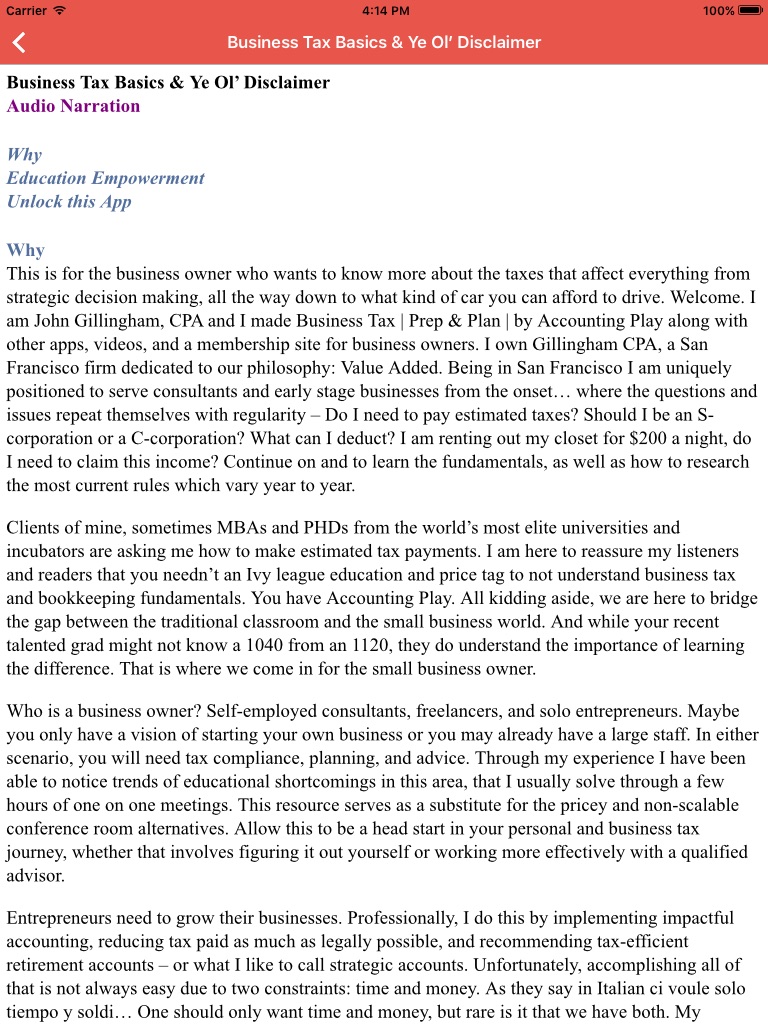 Learn taxes with audio, video, books, and more inside. Focusing on the contractor, freelancer, and sole proprietors - learn the language of tax. Take a dive into the basics, business planning, and specialized chapters for different business types. Look for the crowd funding and paid drivers section for everyone participating in the new, new economy. More strategy, more deductions, and more entrepreneurship empowerment. Brought to you by Accounting Play.