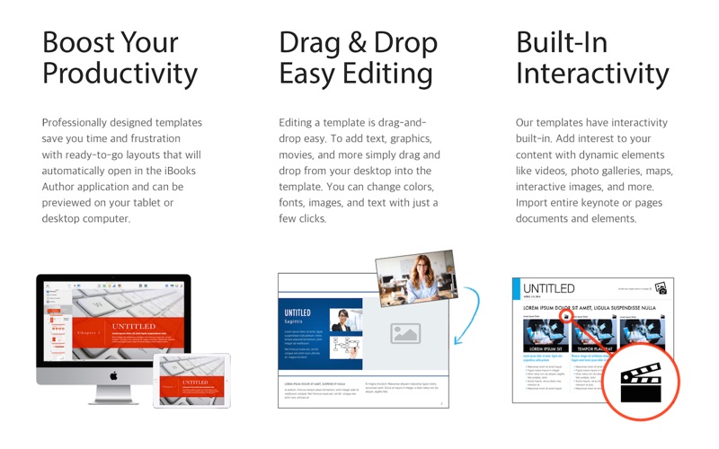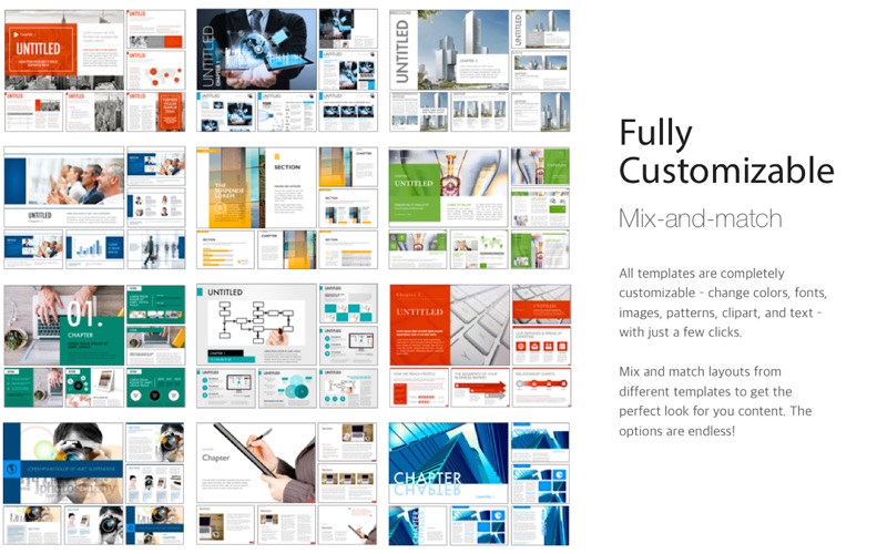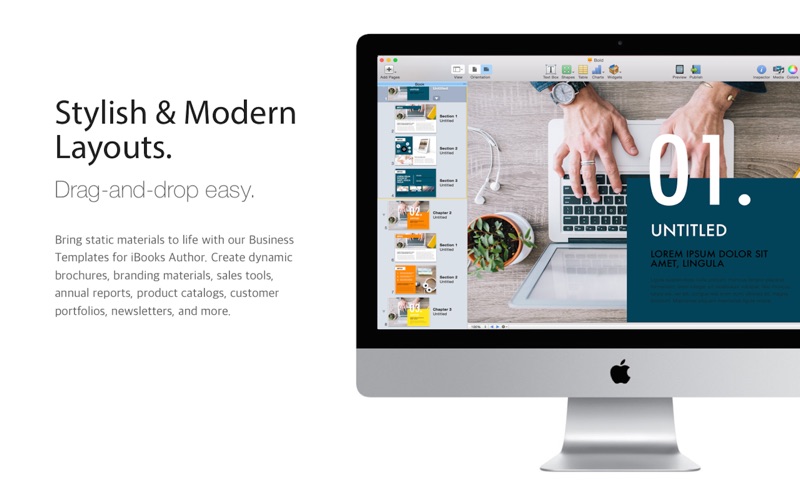Choose from a collection of 20 professionally designed templates to make starting your next project a snap. Each template features a variety of stunning and modern page layouts. Whether you’re creating a business brochure, annual report, marketing presentation, or product catalog, the Business Templates for iBooks Author application helps you create beautiful interactive content in minutes.
