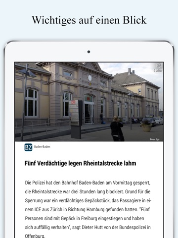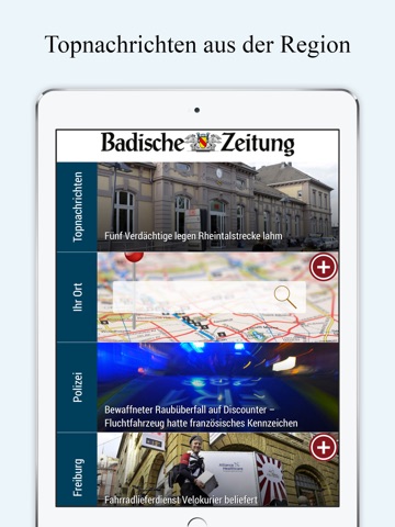 • Personalisierbar: Lokalnachrichten aus dem eigenen Ort (Freiburg, Emmendingen, Bonndorf, Lörrach, Breisach, Elzach, Müllheim uvm.) schnell auf einen Blick