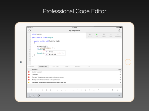 C# Coder is a development tool for C# that lets you create, build and debug C# programs directly on your iOS device with the power of from the Roslyn Project.