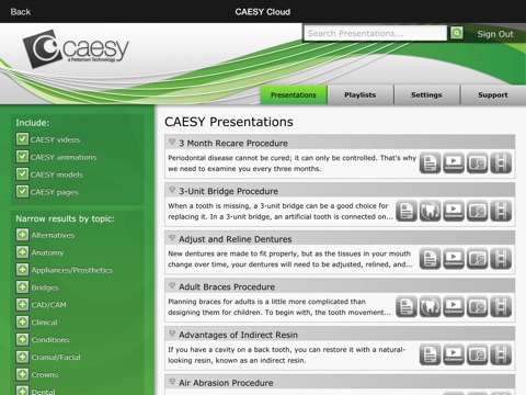 CAESY Cloud allows access to CAESY’s more than 280 multimedia presentations featuring 3D animation, full-motion video, narration and colorful images. Connect with CAESY content from multiple locations and on multiple devices throughout your dental practice at the same time.