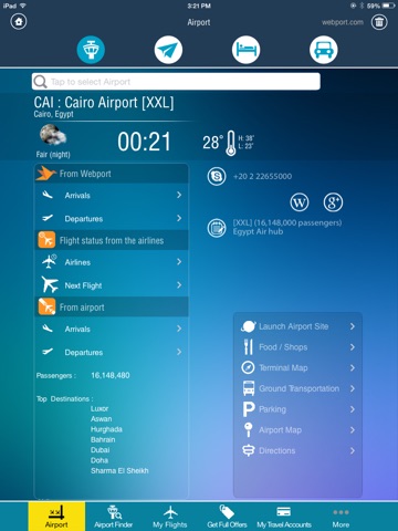 Cairo International Airport (CAI) is the largest airport in Egypt and the second largest airport in Africa. The Cairo Airport is the main hub for EgyptAir. This app provides complete information for Cairo Airport including parking, food and restaurants, terminal maps, directions and more.