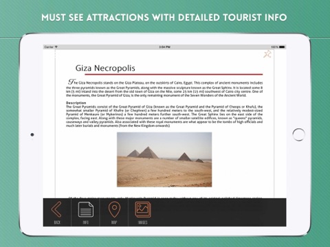 Tourist info for must see attractions such as Giza Necropolis, Great Pyramid of Giza, Great Sphinx of Giza, Egyptian Museum, Cairo Citadel, Mosque of Muhammad Ali, Mosque of Ibn Tulun, Abdeen Palace, Midan Tahrir, Cairo Opera House, Muizz Street, Al-Hakim Mosque, Al-Rifai Mosque, Khan el-Khalili, Al-Azhar Mosque, Al-Azhar University, Cairo University, among others.