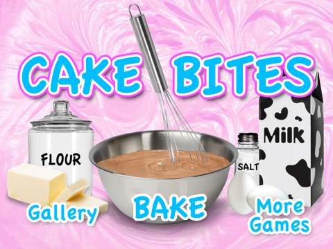Select cake flavor. Mix ingredients. Bake cake batter. Select cake bite shape. Begin decorating cake and select background. Finish by eating cake and save to photo gallery.