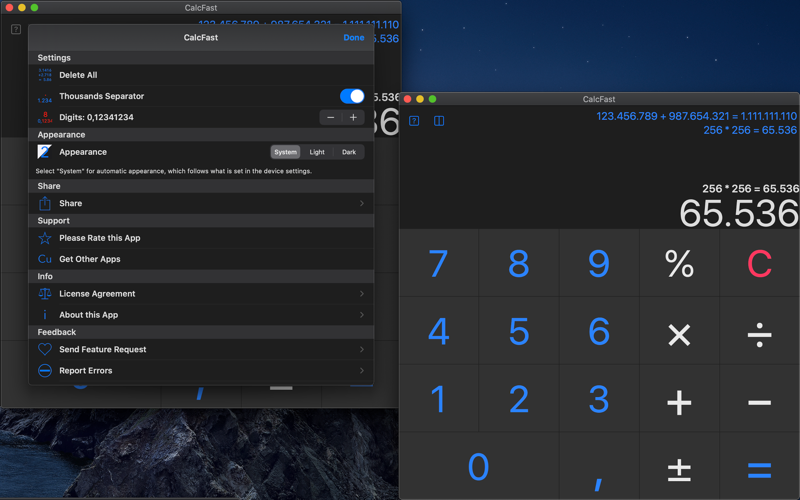 Fast and simple calculator for Mac that shows the calculation history. Numbers are formatted for your country, i.e. period in the US and comma in Europe.