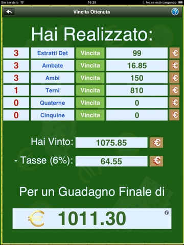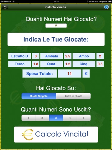 Limpiego di Calcolatore Vincite Lotto è molto semplice e intuitivo: inserisci quanti numeri hai giocato, quanti euro hai giocato per ogni combinazione, se hai giocato su ruota singola o su tutte le ruote e quanti numeri sono usciti e lapplicazione ti dirà quanto hai vinto al netto delle tasse che si pagano allo stato.